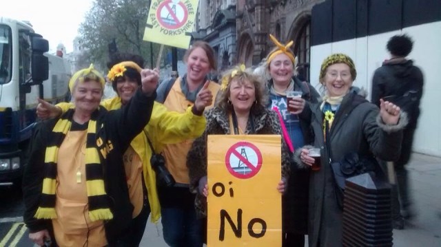 Today people gathered in Park Lane opposite Hyde Park for the Climate Justice and Jobs March. We had some powerful voices representing our global society which feels threatened by climate change and lack of action. Politicians from Liberal Democrats, Labour and Green Party but none from our Conservative government who had been invited. We heard speakers from nations most affected especially Global South and in spite of the rain our spirits were lifted by standing in solidarity. It was good to see the thousands who had made the effort to be there and to see the children’s involvement too! The rain didn’t last long and the wind became strong from time to time. Much creativity went into some costumes, animal masks and banners. We enjoyed the carnival atmosphere with the drumming and the Nanas singing new and familiar anti-fracking songs!