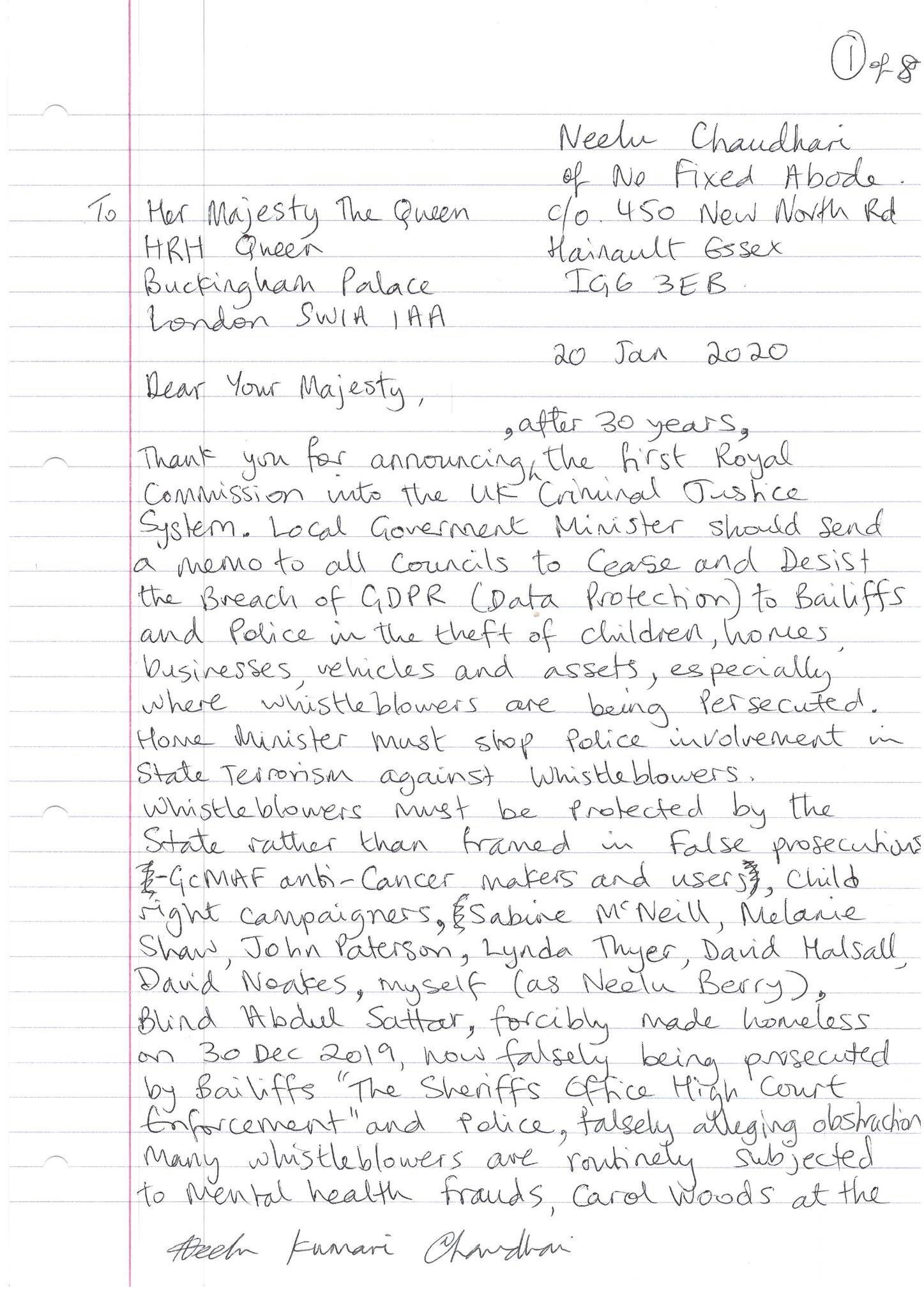 So, as you all know, I wrote my 8 page hand written letter with the 39 pages of attachments and posted it by Registered Post to Her Majesty The Queen on 21 Jan 2020.